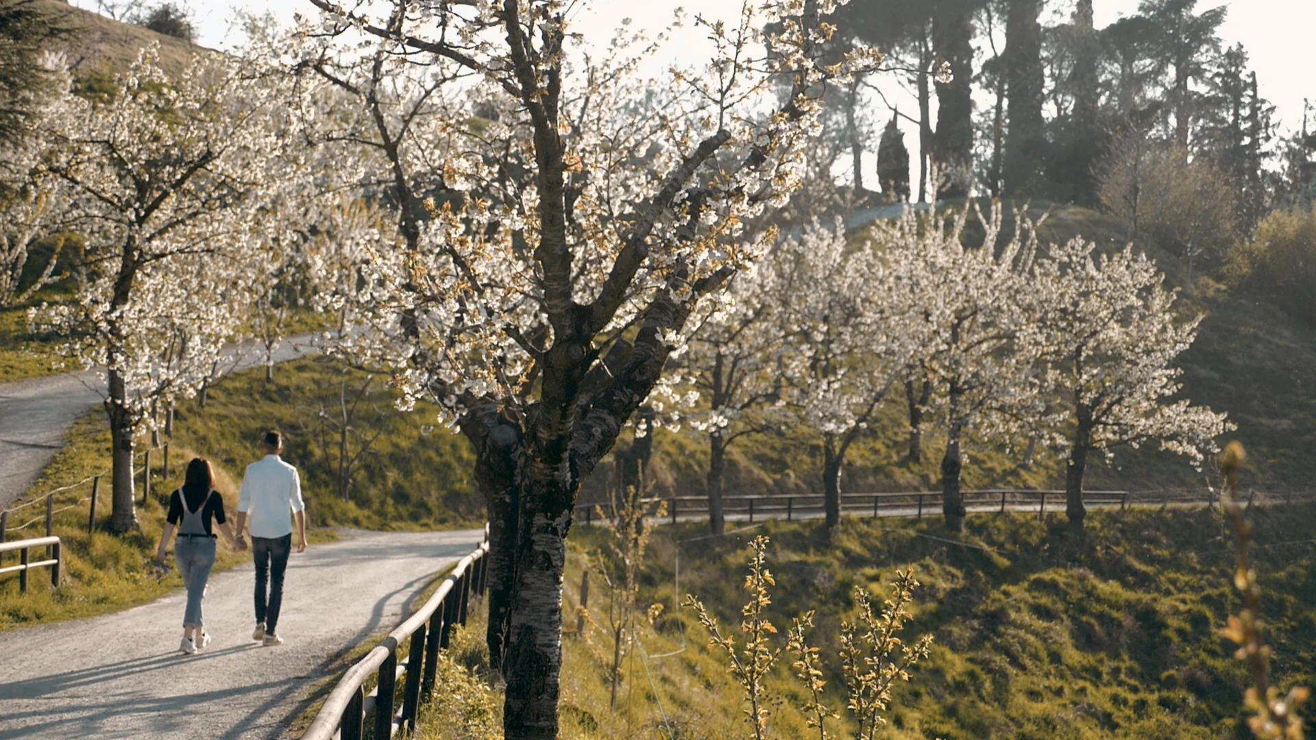 Le luci del tramonto baciano i ciliegi in fiore quando la primavera sboccia tra le colline di San Benedetto . Una passeggiata romantica tra colori e paesaggi fanno da cornice ad Arianna e Omar nel loro servizio video prematrimoniale.